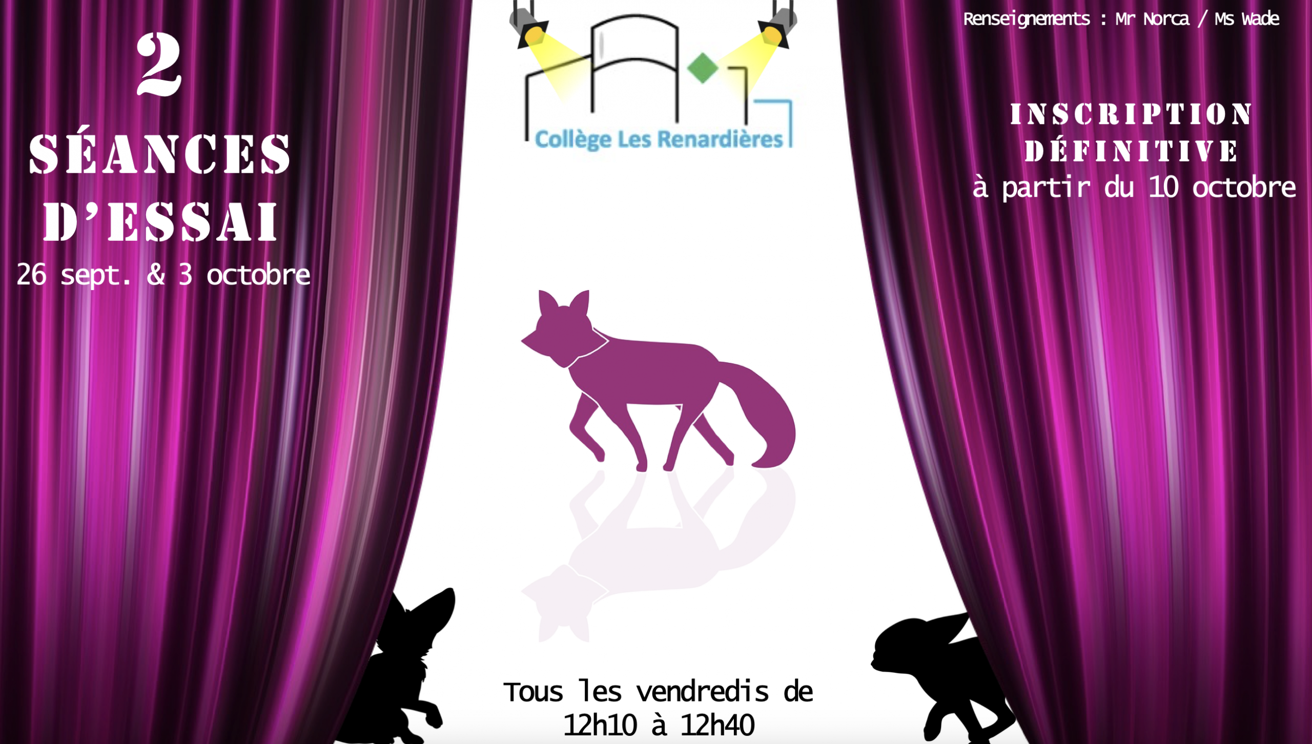 Le drama club a lieu le vendredi midi de 12h10 a 12h40 en salle de réunion. Ce club est organisé par Mme. Wade et M. Norca pour les élèves de 5eme, 4eme, 3eme et les 6eme faisant l’option SI Américain. Ce club permet aux élèves d’être plus à l’aise sur scène, d’utiliser de nouvelles méthodes, de pratiquer l’anglais et de se divertir lors du projet de théâtre.